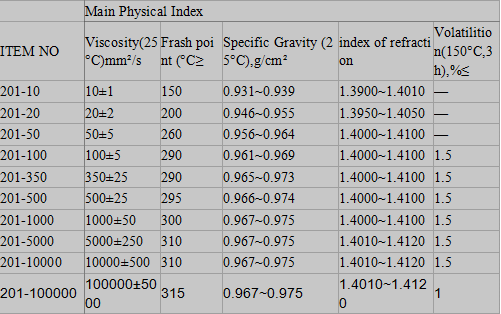 Dimethyl Silicone Fluid is avirulent insipidity, with the characters of physiological inertia, excellent chemical stability, electrical insulation and antiweatherability. It also pressents hydrophobicity and high shear-resistance property.All these superior performances can shown for a long period between the temperature range from -80°C to 180°C.